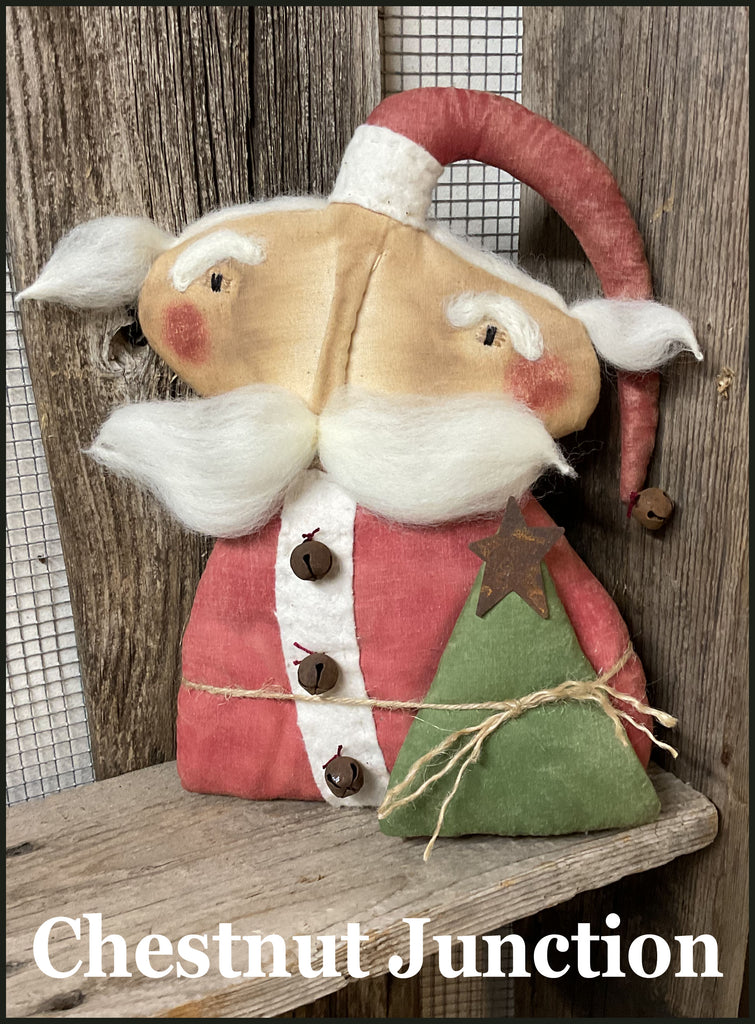 Tree Claus is a whimsically primitive Santa with his skinny hat and folky little Christmas Tree. He will measure 9" when complete.